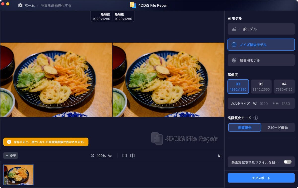 解像度は等倍の「X1」に設定して、「右下の高画質化を開始」をクリック。